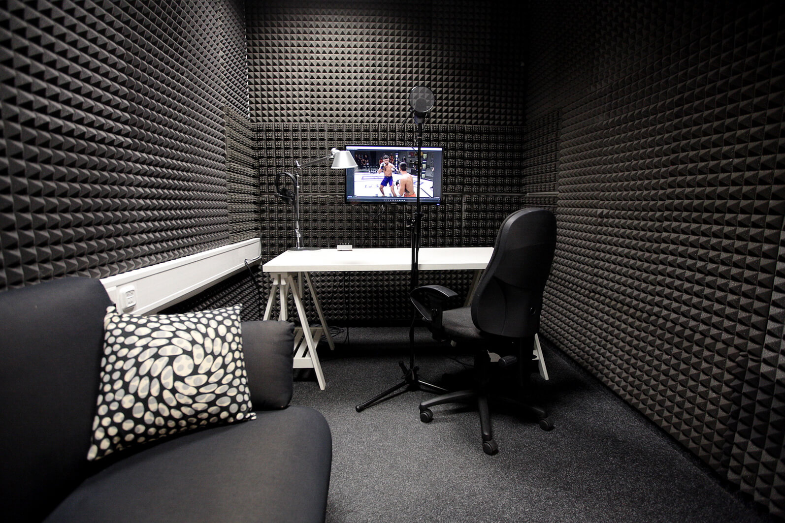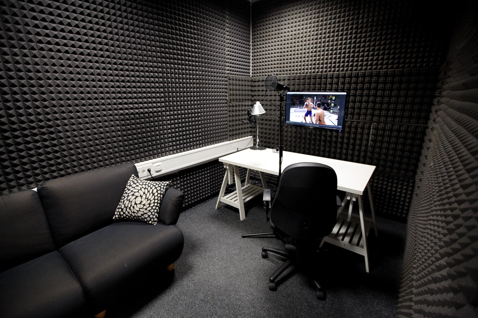 Unsere Tonkabine ist komfortabel für bis zu drei Personen nutzbar und ist optional mit der Tonregie im Nebenzimmer verbunden.